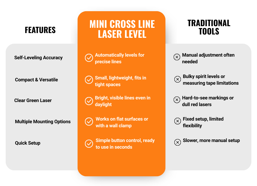 Say goodbye to pencil marks, tape, or guesswork. With a secure suction hold on any surface, this laser level keeps your project accurate and your walls spotless. From glass to concrete, you get precision alignment without the mess.